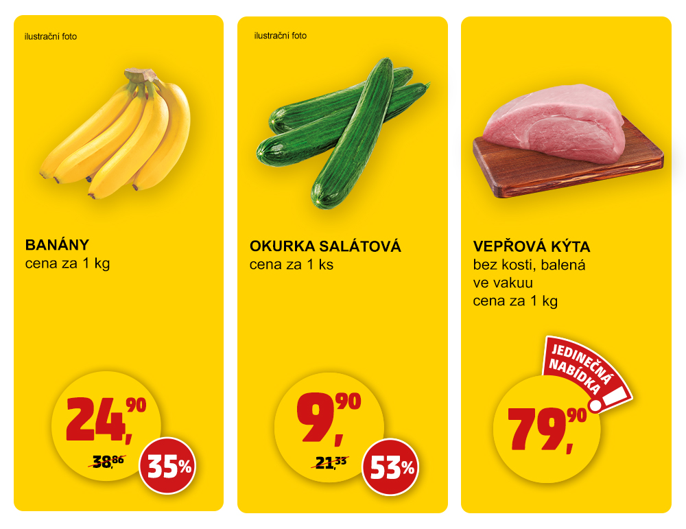 Užijte si nákup našich čerstvých a kvalitních potravin za vždy nízké ceny. Nyní u nás najdete za výjimečné ceny okurky, banány, vepřovou kýtu a mnoho dalšího. Nezapomeňte si před návštěvou své oblíbené prodejny prolistovat náš nový leták, který je plný akčních nabídek pro každého.