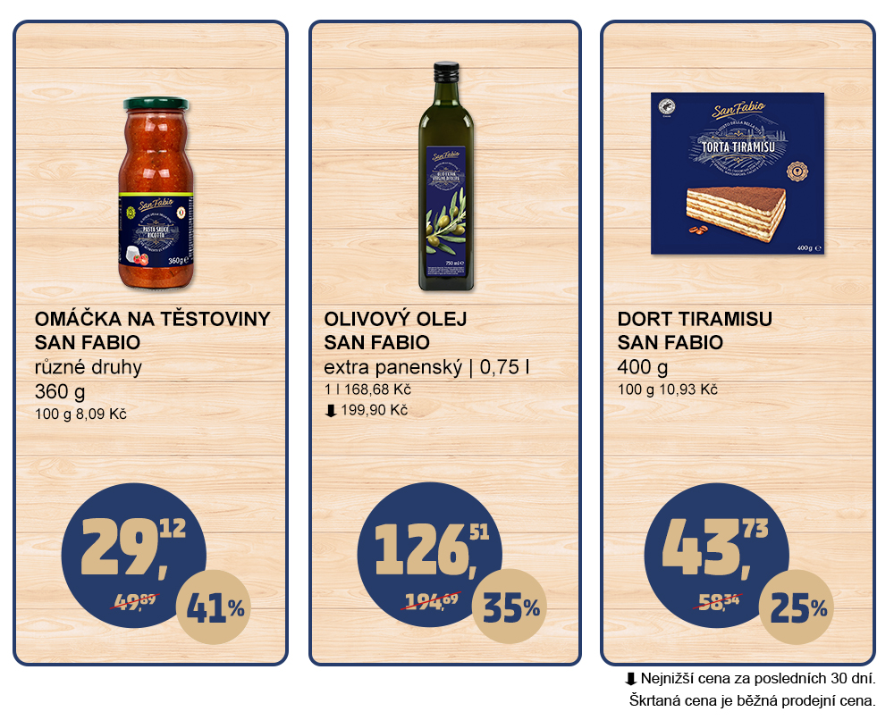 Vychutnejte si naše oblíbené produkty San Fabio, které Vás svou chutí přenesou do prosluněné Itálie, za nízké ceny! Nezapomeňte si do košíku dát omáčku na těstoviny, olivový olej nebo dort Tiramisu. To a mnohem více z naší italské nabídky najdete u nás v PENNY. |