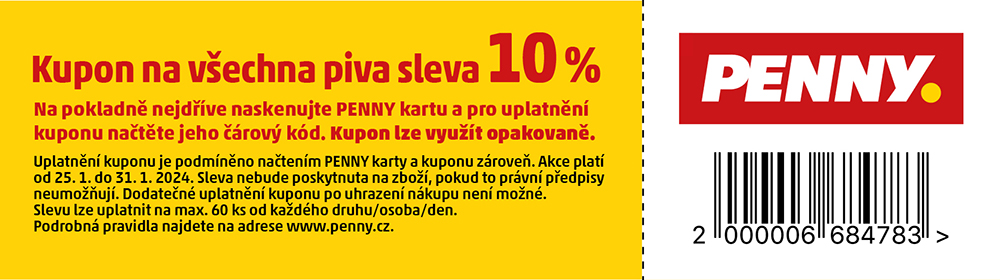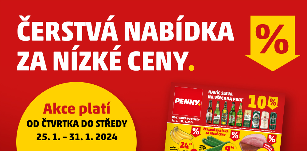 Nabídka letáku je platná od 25. 1. 2024 do 31. 1. 2024, není-li uvedeno jinak. Nabídka zvýhodněných cen vybraných produktů může být omezena na kratší dobu (například i na jeden den). Více informací najdete na. www.penny.cz/nabidky/letaky.